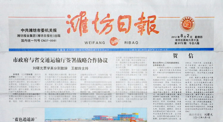 濰坊市市長(zhǎng)劉曙光給魯臺(tái)會(huì)展中心工程各參建單位、全體參建人員的賀信在濰坊日?qǐng)?bào)2012年8月