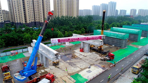 熱烈祝賀集團(tuán)寶通街快速路工程第一片預(yù)制箱梁順利吊裝完成