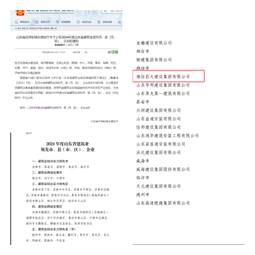 近日,山東省住房和城鄉(xiāng)建設(shè)廳發(fā)布了《關(guān)于公布2024年度山東省建筑業(yè)領(lǐng)先市、縣(市區(qū))、企業(yè)的通知》(魯建建管字[2025]5號(hào))。集團(tuán)公司被評(píng)為2024年度山東省建筑業(yè)領(lǐng)先企業(yè)。